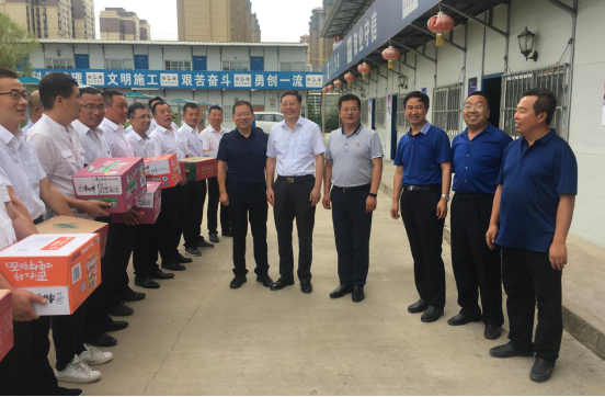 8月9日上午,延安大學校長張金鎖,副校長楊偉宏,校辦主任劉述進、工會主席白澤生一行到延安大學新校區項目慰問一線職工,陜建十三公司董事長、總經理卜國平一同慰問,延大校辦、工會及新校區辦公室相關負責人參加慰問活動。