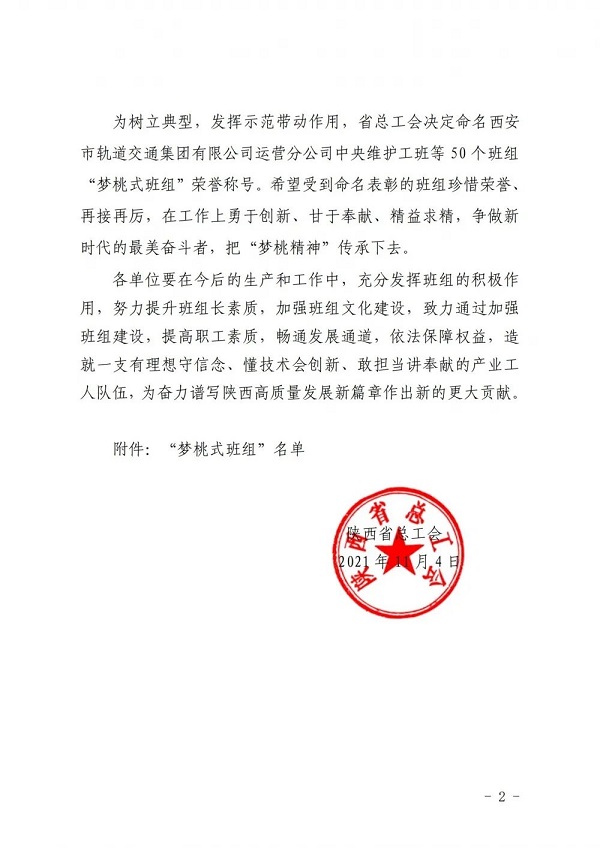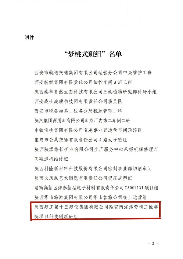為進一步傳承和弘揚“高標準、嚴要求、行動快、工作實、搶困難、送方便”和“不讓一個伙伴掉隊”的“夢桃精神”,近日,陜西省總工會對全省50個優秀班組進行了榮譽表彰,授予他們“夢桃式班組”榮譽稱號,集團延安南泥灣勞模工匠學院項目科技創新班組獲此殊榮。